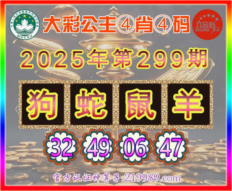 299期:《大彩公主》 🍒④肖④码🍒【狗鼠羊】【32.49.06.47】开:蛇49