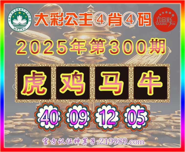 300期:《大彩公主》 🍒④肖④码🍒【鸡马牛】【40.09.12.05】开:虎40